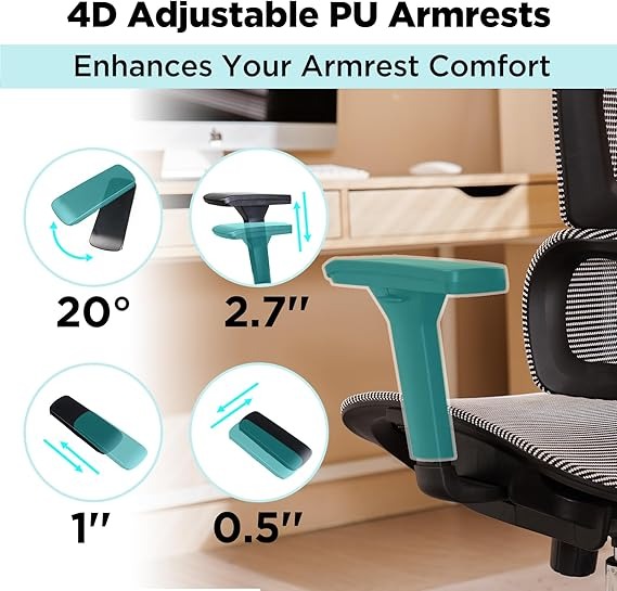 Our mesh office chair features a 4-point support system, with extra wide & update 4D adjustable armrests wrapped in soft PU material, reducing strain on your arms and shoulders. The ergonomic lumbar support and waterfall-shaped mesh cushion alleviate pressure on your lower back, thighs, and buttocks, ensuring comfortable sitting for hours. Customize your comfort with the 3-position tilt and lock feature.