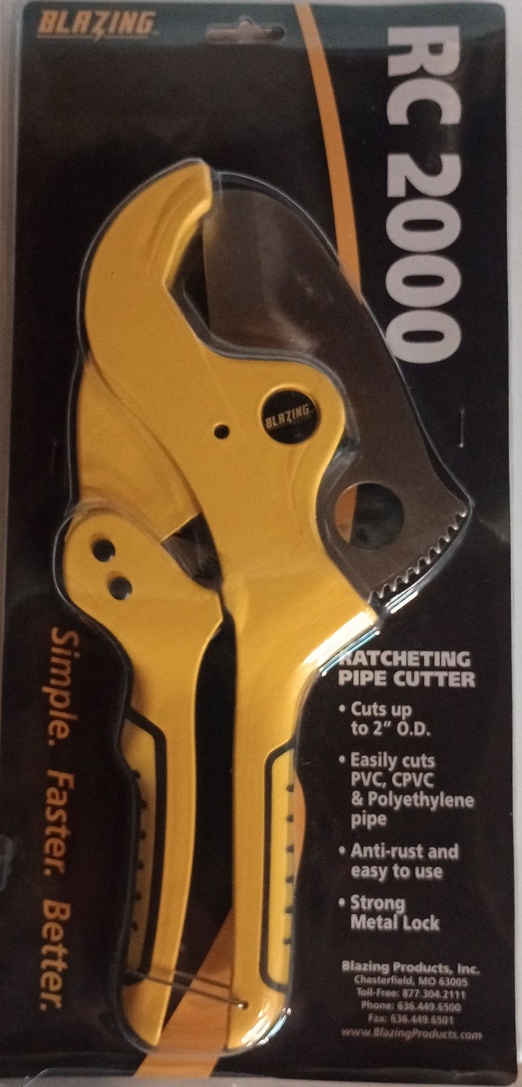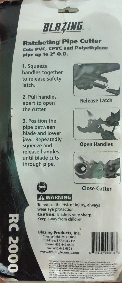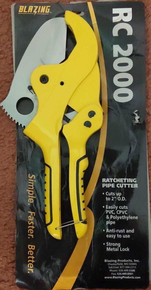ratcheting pipe cutter cuts up to 2 in o. d. easily cuts PVC CPVC and polythene pipe anti-rust and easy to use strong metal lock blazing productions incorporated Chesterfield Missouri 63005 simple better faster RC 2000 squeeze handles together to release safety latch pool handles apart to open the cutter position the pipe between blade and lower jaw repeatedly squeeze and release handles until blade cuts through pipe This has to be the easiest way to cut pipe I have never seen such an easy tool to use I know people that have bought them just to cut tree branches all kinds of different things I've seen people use them for a multitude of different jobs I recently used them for cutting PEX water pipes they made a great cut and super fast and easy I have a lot of inventory so contact me for price on bulk.