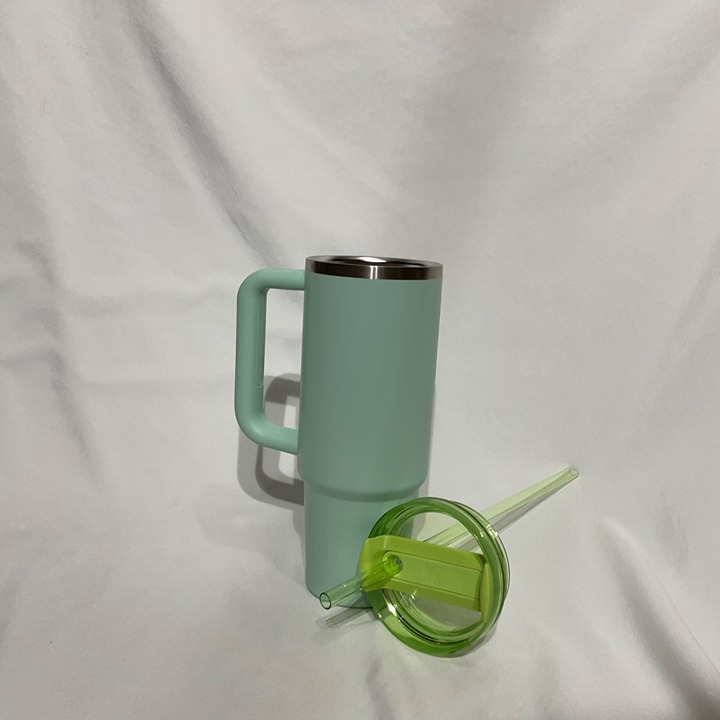 This tumbler offers a durable and insulated design that maintains beverage temperature for hours. Equipped with a handle and straw, it's practical and easy to use.